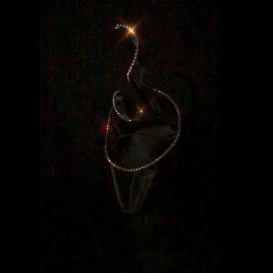 This collection was made to be worn in the dark. Made with very few materials: sheet crin, diamanté chain and silk flowers – wired to create beautiful, three-dimensional shapes. We photographed and filmed them on a model wearing a black ‘morph-suit’ leaving just the sparkling shapes, floating in the Infinite.