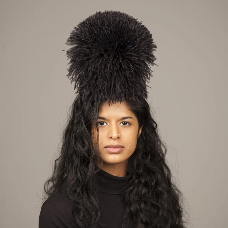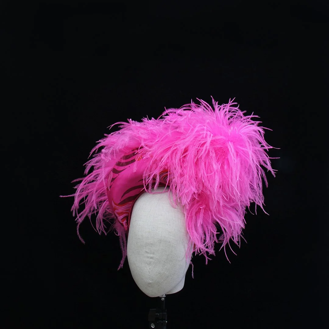 A dark collection, with flashes of brights, in black felts and leopard-print, with ostrich feather pompoms and laser-cut veiling. The collection is a work-in-progress and explores the idea of the natural world hiding patiently in the shadows, waiting for a great danger to pass, to creep back out; red in tooth and claw. The collection was photographed on Fashion Media & Promotion students at UCA Rochester, celebrating their personal achievements and individuality.