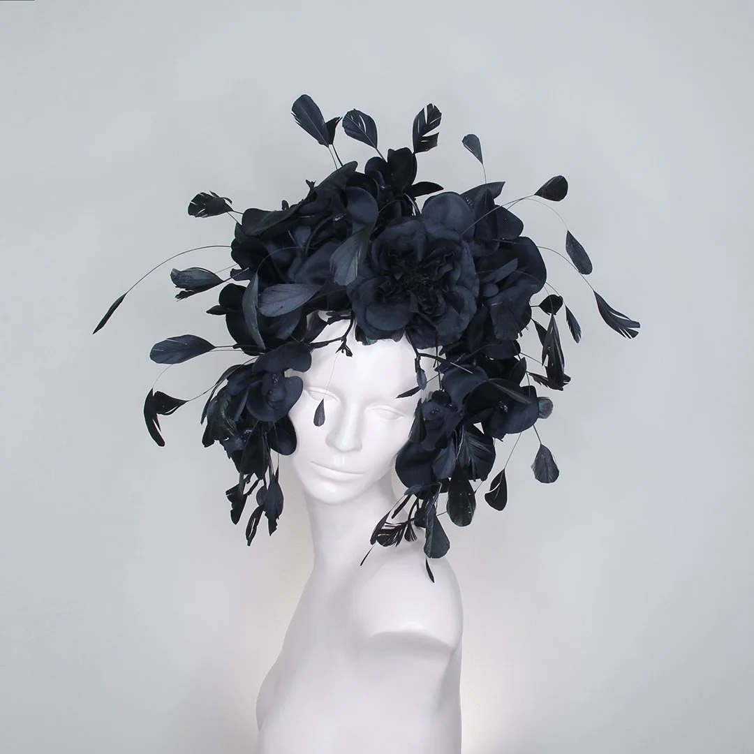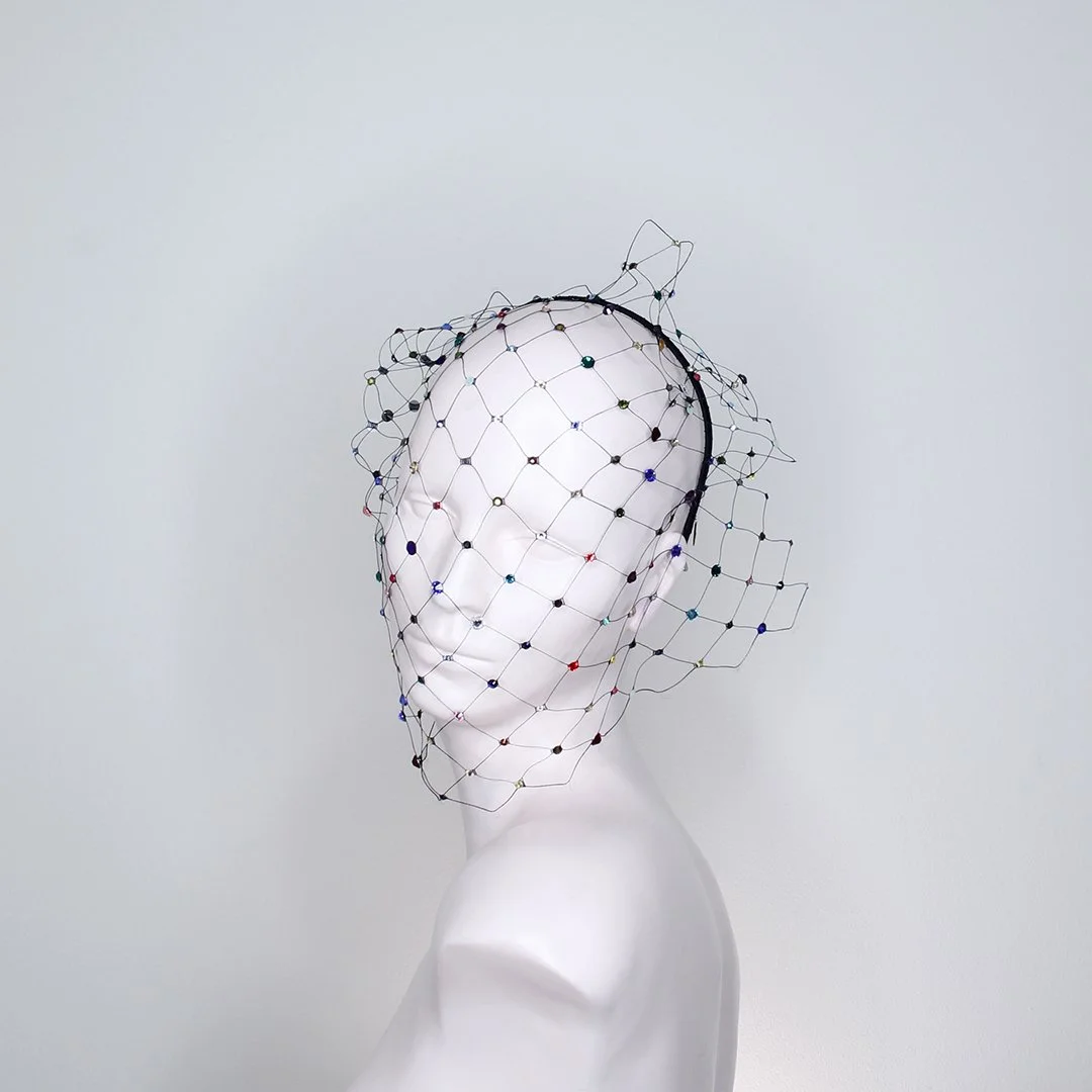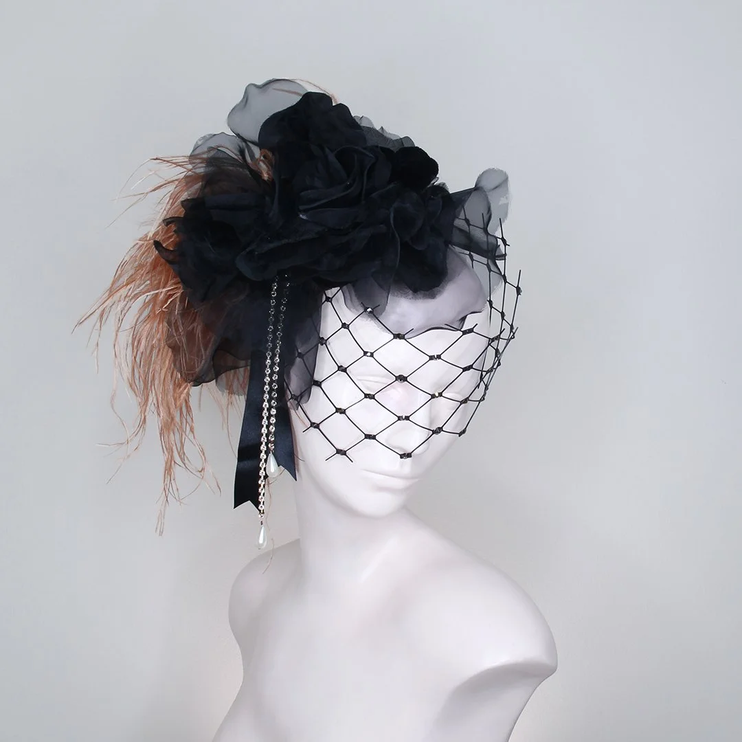 Soot orchid headdress with stripped quill trim and diamanté veil.