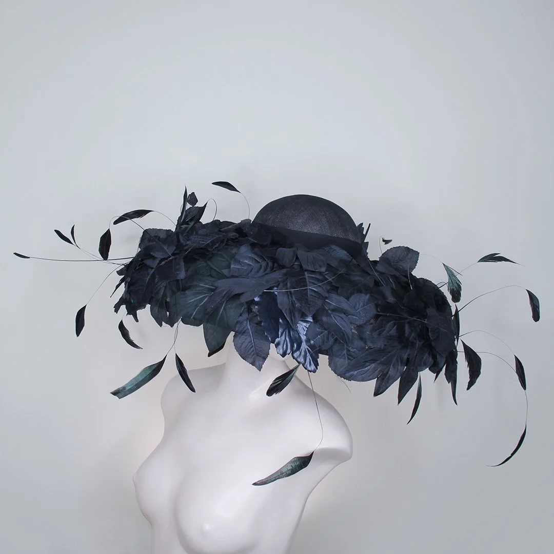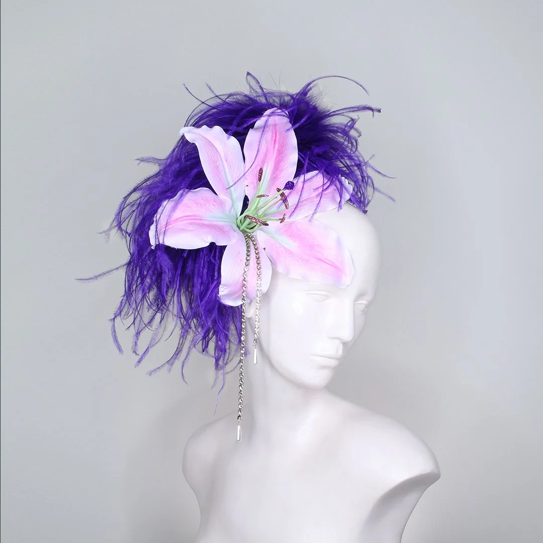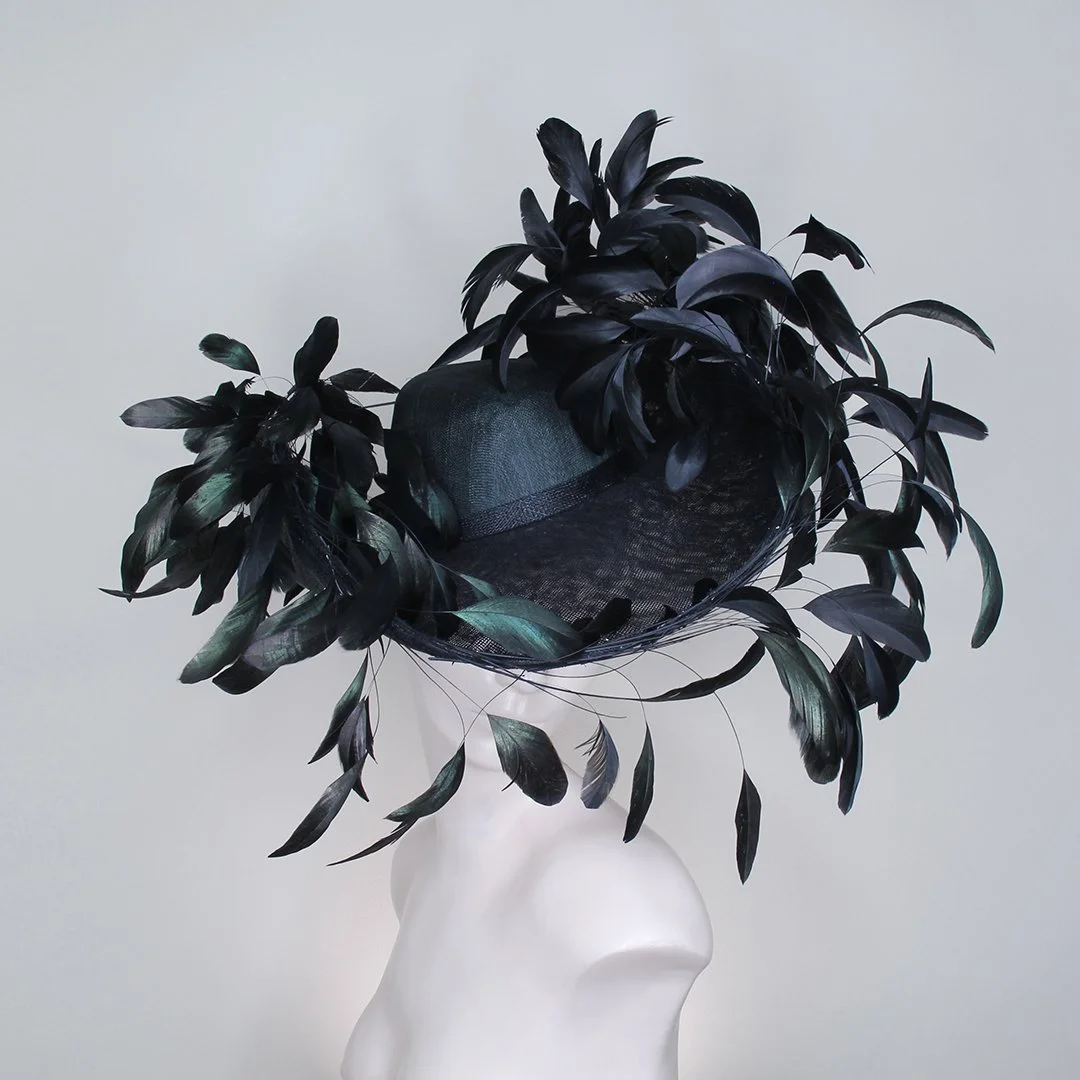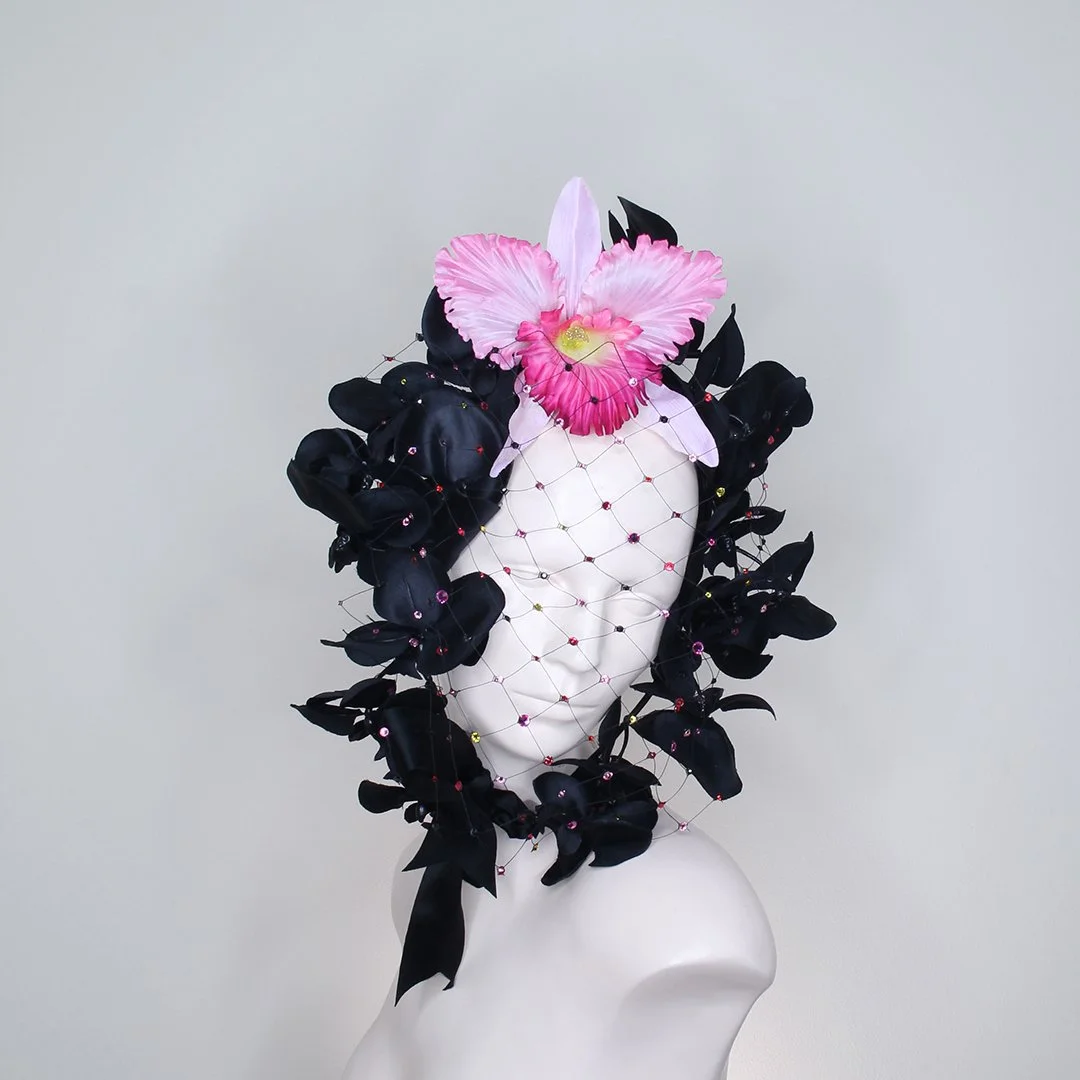 Soot orchid headdress with stripped quill trim and diamanté veil.