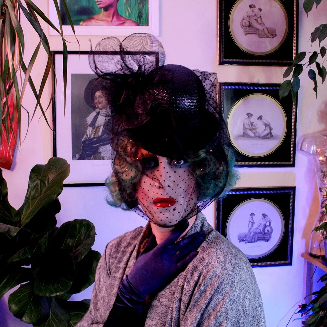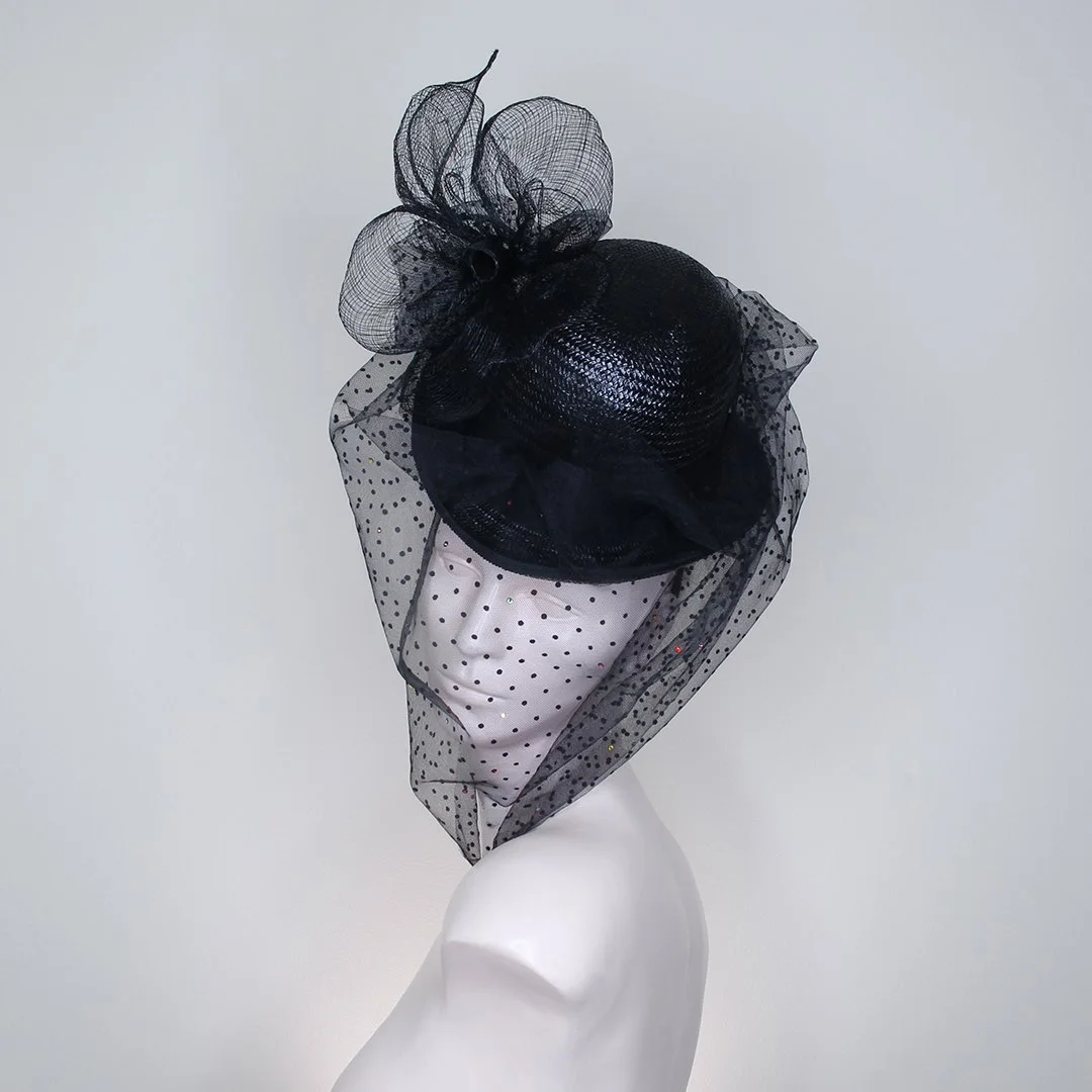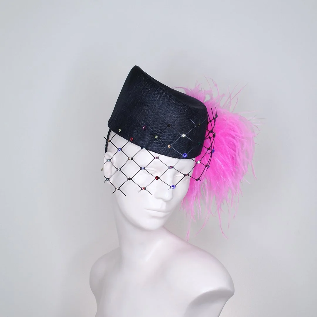 Kohl sinamay pillbox with veil and flamingo pouffe.