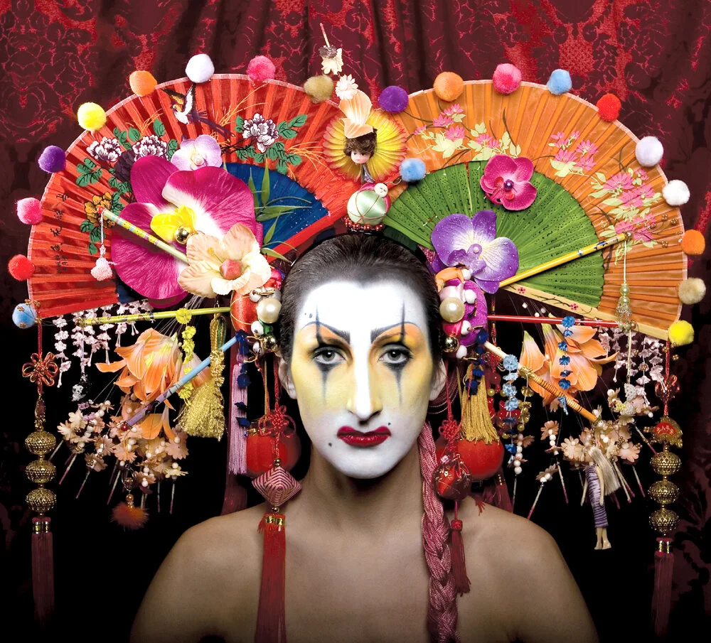 But the story doesn’t necessarily end with them. Waiting in the wings of this drama, watching closely from the periphery, is an androgynous figure in oriental costume. In her elaborate fanned headdress you can spot pom-poms, plush toys, flowers – all the elements of the other characters. She is the future, full of possibility and peril.